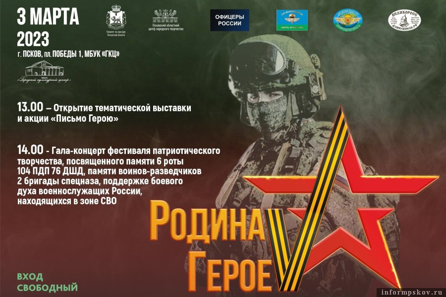 Гала-концерт областного фестиваля патриотического творчества «Родина ГероеV» состоится 3 марта в Городском культурном центре Пскова.