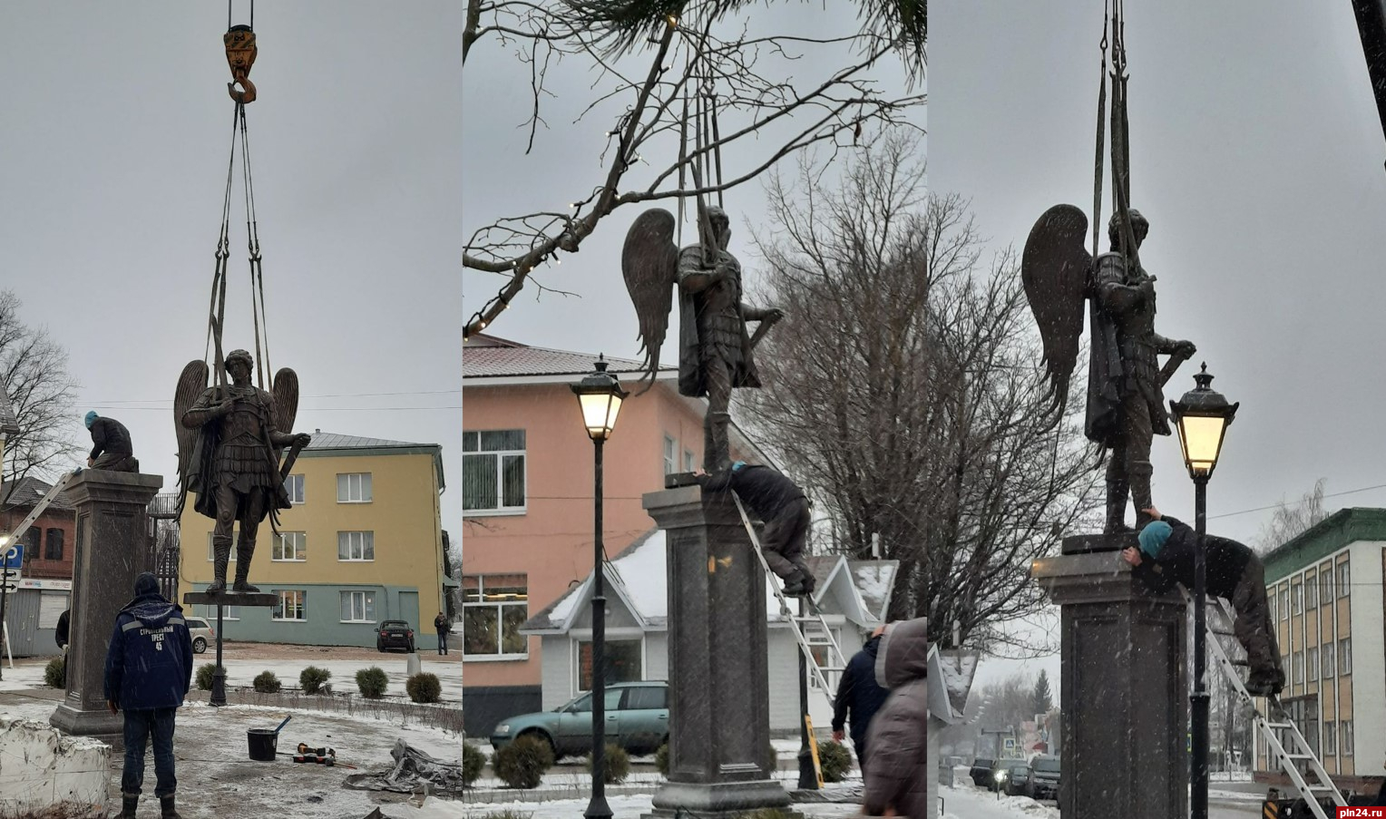 Памятник архангелу Михаилу установили в Печорах сегодня, 23 декабря, сообщил Псковской Ленте Новостей читатель.