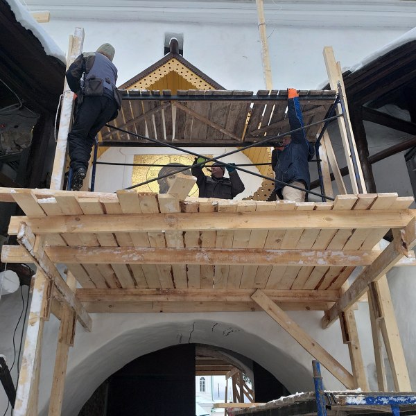 В Печорах продолжается реставрация объекта культурного наследия федерального значения «Башня Святых ворот», которая входит в Ансамбль Псково-Печерского монастыря.