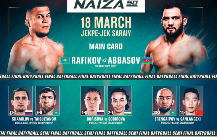 Бой на защиту пояса лиги «NAIZA» состоится 18 марта в Астане, в дворце единоборств «Jekpe-Jek». Трансляция поединков начнется в 20.00 по московскому времени на YouTube-канале «NAIZA TV».