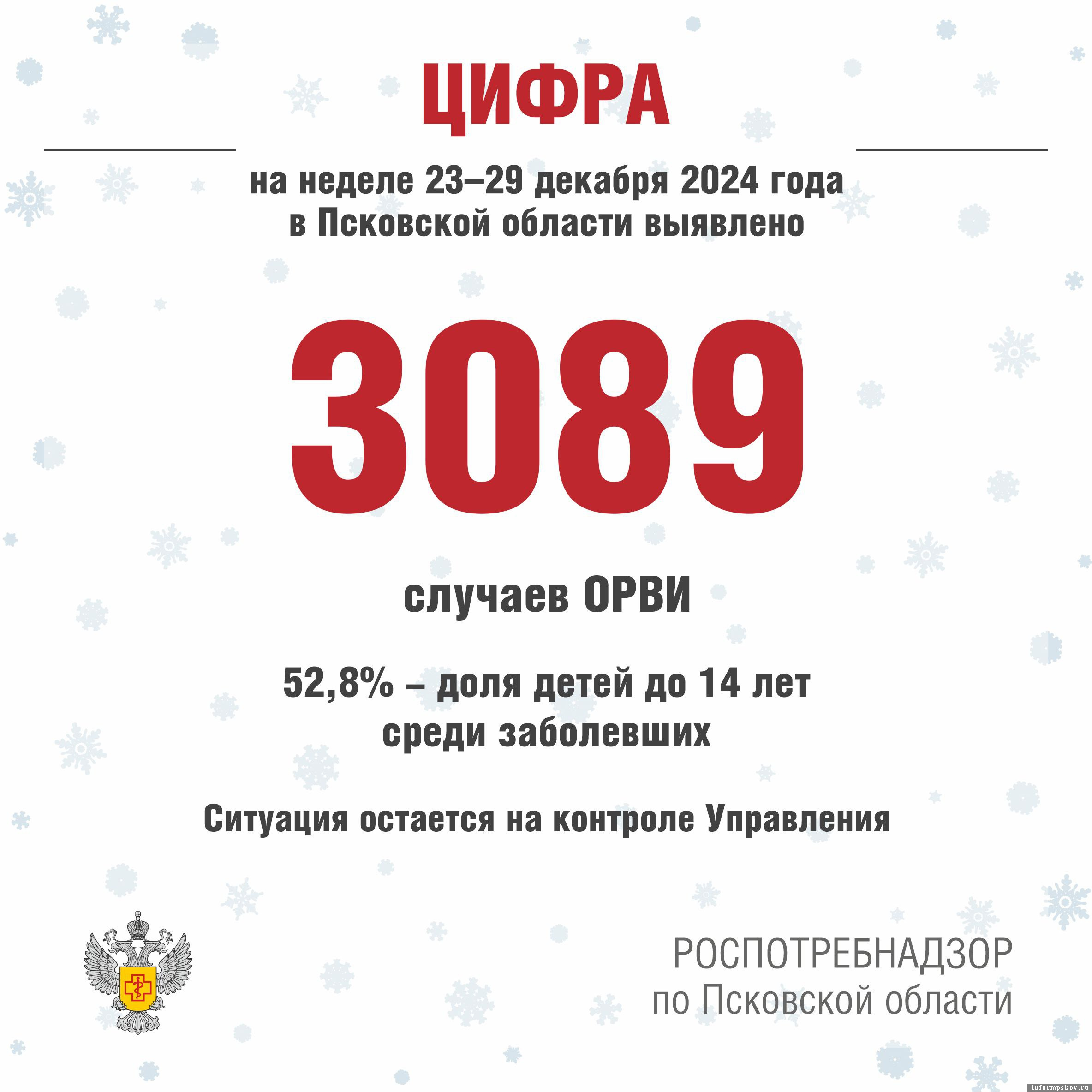 3 089 случаев ОРВИ выявлено в Псковской области с 23 по 29 декабря. Доля детей до 14 лет среди заболевших составляет 52,8%, сообщили ПАИ в пресс-службе регионального управления Роспотребнадзора.