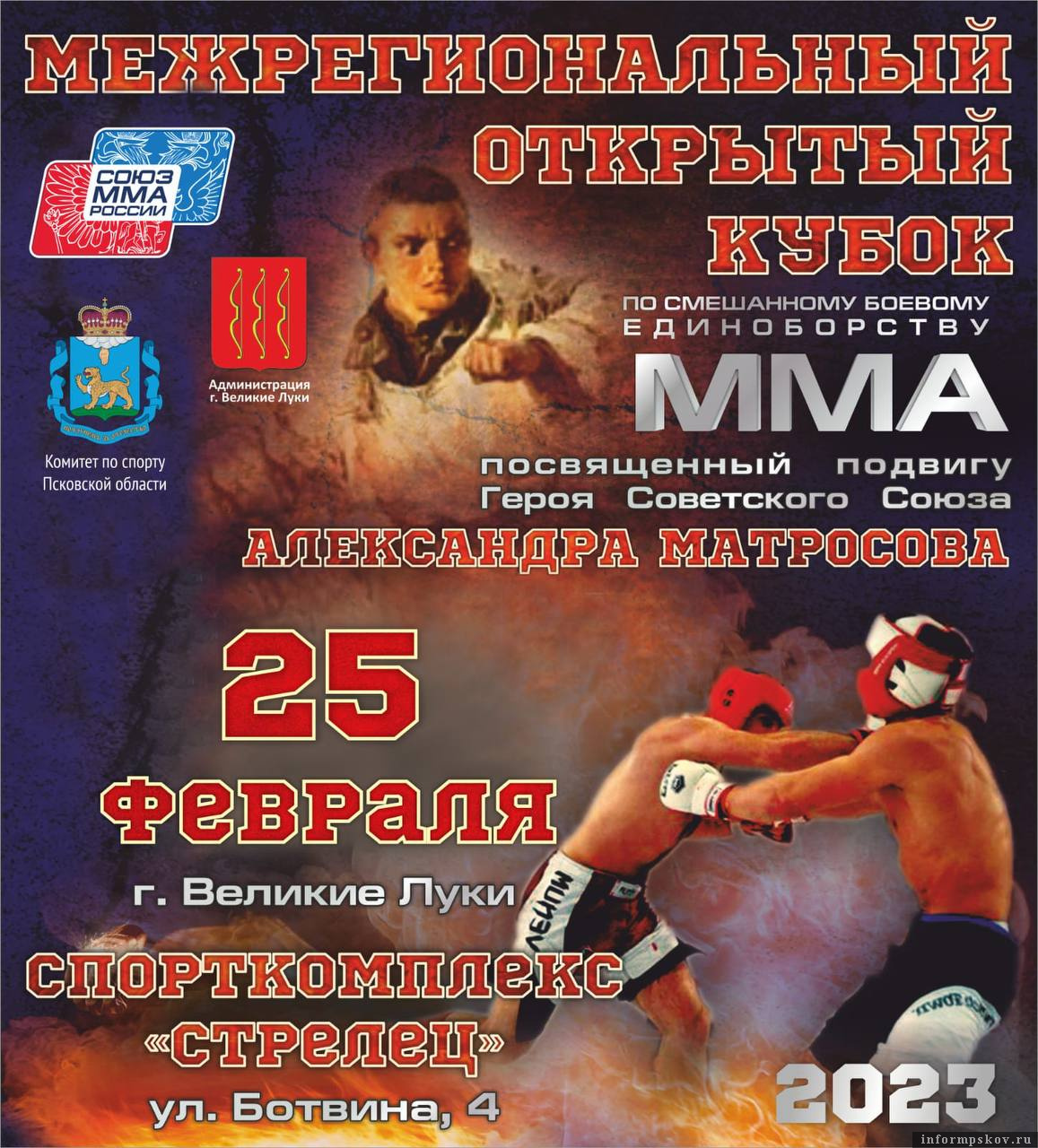 Десятый межрегиональный открытый кубок по смешанному боевому единоборству ММА, посвященный подвигу Героя Советского Союза Александра Матросова, пройдет в СОК «Стрелец» в Великих Луках, 25 февраля.