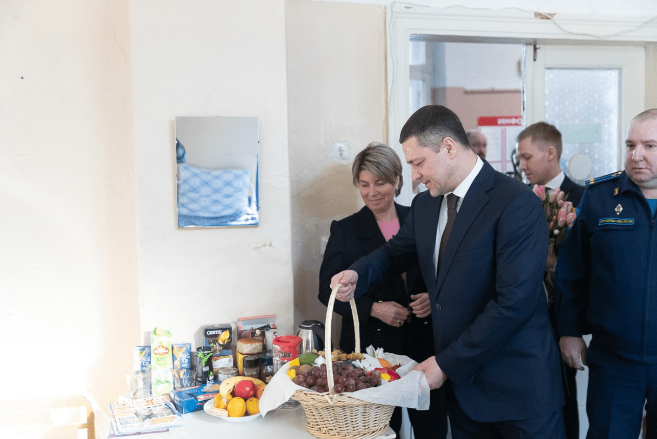 Военнослужащие проходят здесь лечение после ранения или по болезни. Глава региона пожелал всем скорейшего выздоровления и передал корзины с фруктами.