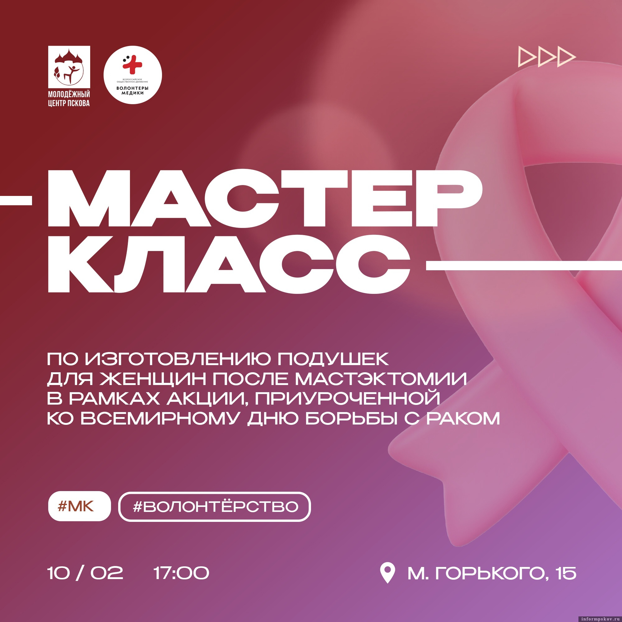 Псковскую молодёжь приглашают принять участие в мастер-классе по изготовлению подушек для женщин после мастэктомии в рамках всероссийской акции, приуроченной ко Всемирному дню борьбы с раком .