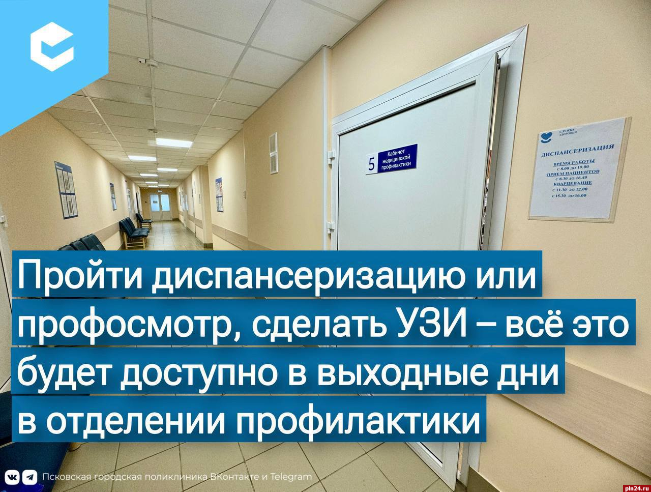 Пройти диспансеризацию за один день можно в отделении медицинской профилактики Псковской городской поликлиники в выходные дни и по будням. Об этом напомнили в Telegram-канале городской поликлиники Пскова.