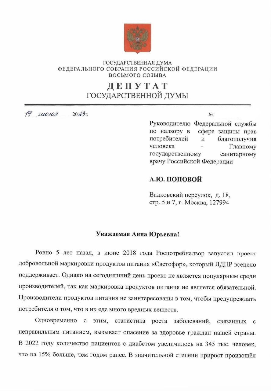 -Таким образом, без каких-либо сомнений люди смогут выбрать для себя полезную пищу. И это позитивно скажется на их здоровье. Об этой инициативе в своем обращении рассказал руководителю Роспотребнадзора Анне Юрьевне Поповой и попросил её направить на моё имя статистику и основные выводы по проекту "Светофор" для более качественной работы над законопроектом,- рассказал депутат.